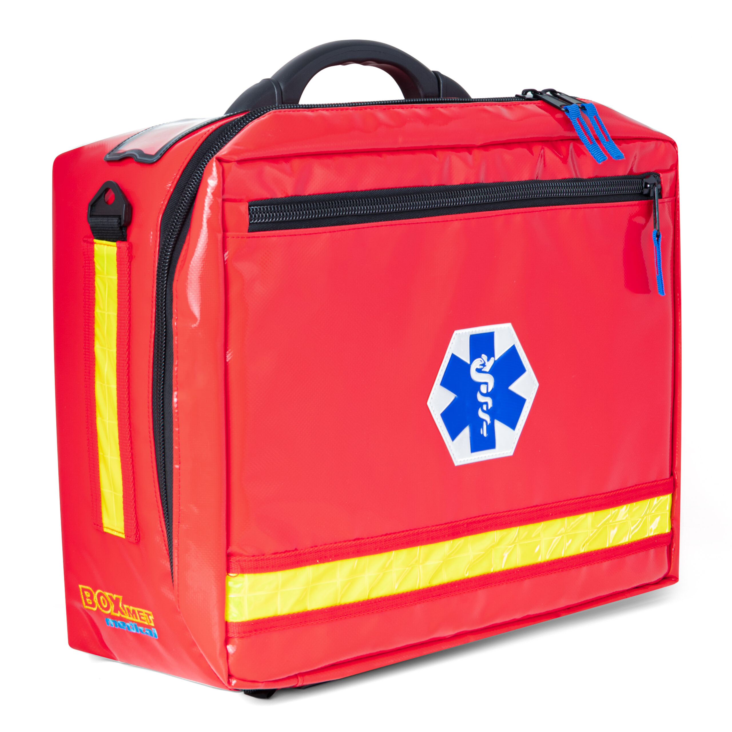 Na zewnątrz torby znajduje się praktyczna kieszeń boczna – idealna na dokumentację medyczną lub drobne akcesoria, które zawsze muszą być pod ręką. Ergonomiczne uchwyty oraz regulowany pasek na ramię zapewniają wygodę noszenia i mobilność w każdych warunkach.