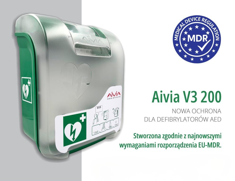Szafka AIVIA V3 wspiera również zarządzanie urządzeniem – wykonuje cotygodniowe autotesty, rejestruje historię zdarzeń, a dzięki technologii NFC wszystkie dane można odczytać w prosty sposób przy użyciu smartfona. Oznaczenia na froncie (symbol AED, instrukcja otwarcia i schemat „łańcucha przeżycia”) dodatkowo ułatwiają obsługę w sytuacjach nagłych.