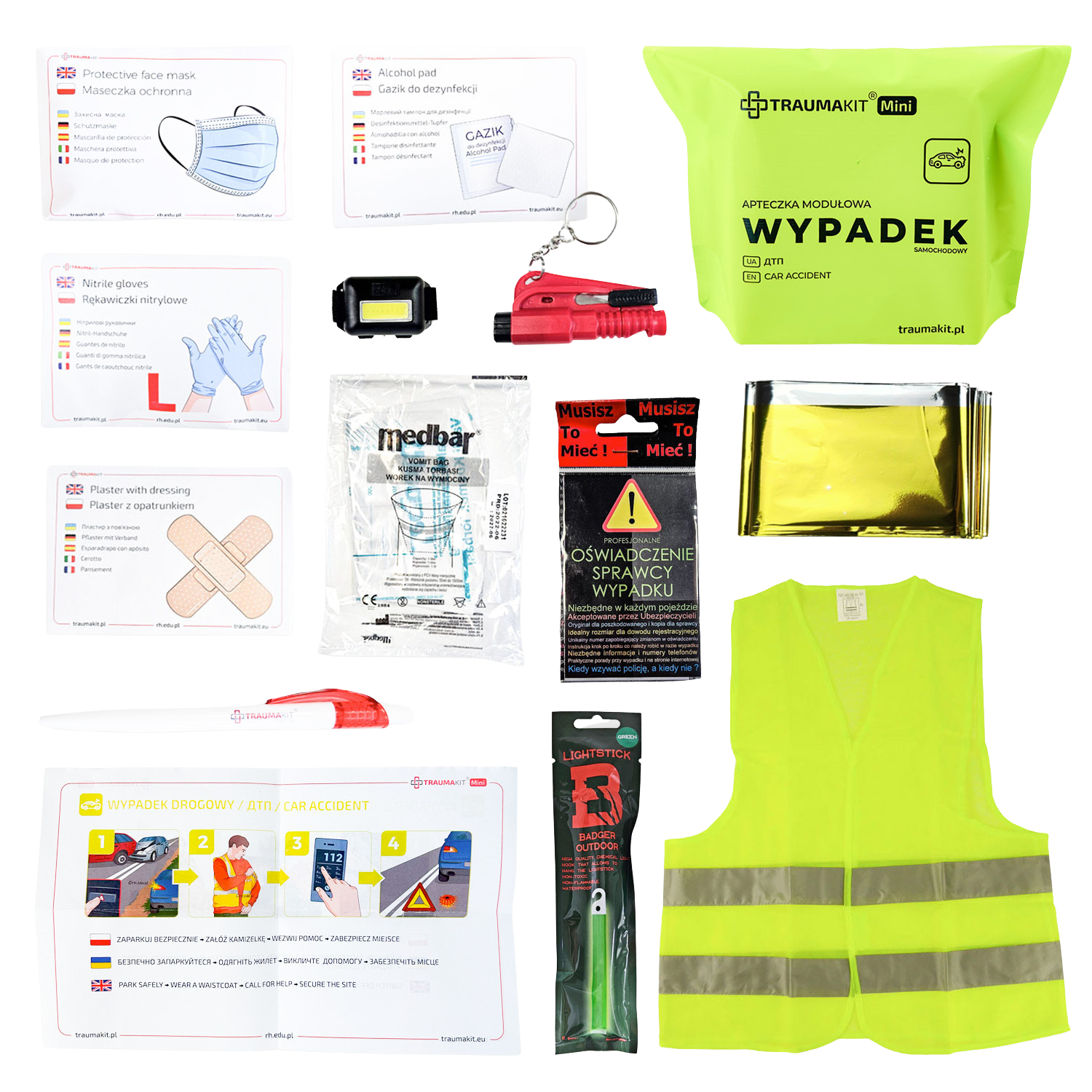 Moduł Wypadek Mini, to twoja skuteczna tarcza bezpieczeństwa w przypadku nieprzewidzianych sytuacji drogowych. Wyposażenie takie jak kamizelka odblaskowa, młotek bezpieczeństwa czy koc termiczny umożliwiają skuteczną interwencję w nagłych sytuacjach.