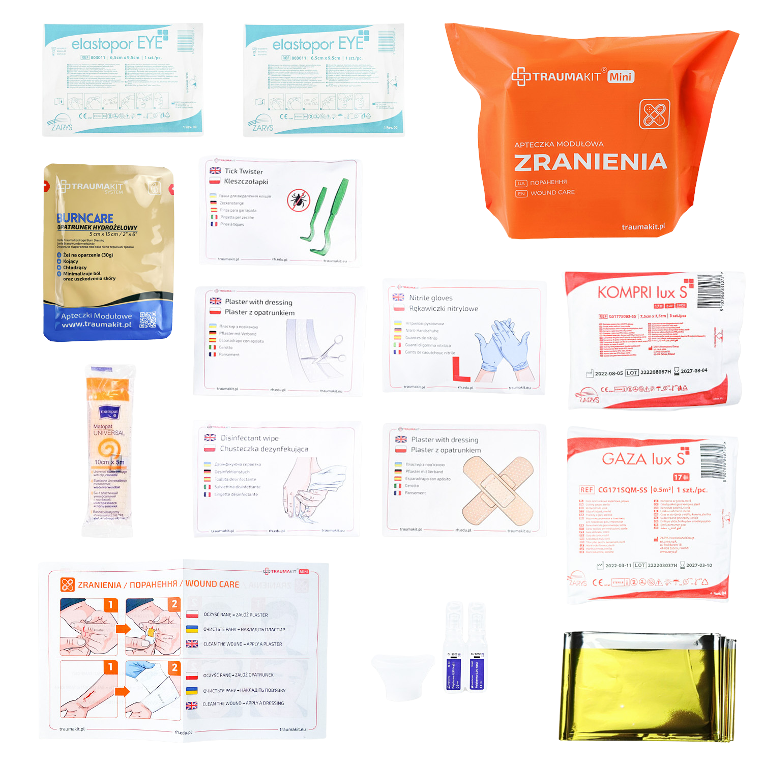 Asortyment opatrunków TRAUMAKIT Mini Zranienia, umożliwia niesienie pomocy przy wszelkiego rodzaju zranieniach, skaleczeniach czy lekkich krwawieniach. Bogata gama gaz, plastrów i bandaży zapewni bezpieczeństwo podczas rodzinnych wakacji, wyjazdów harcerskich czy rowerowych eskapad.
