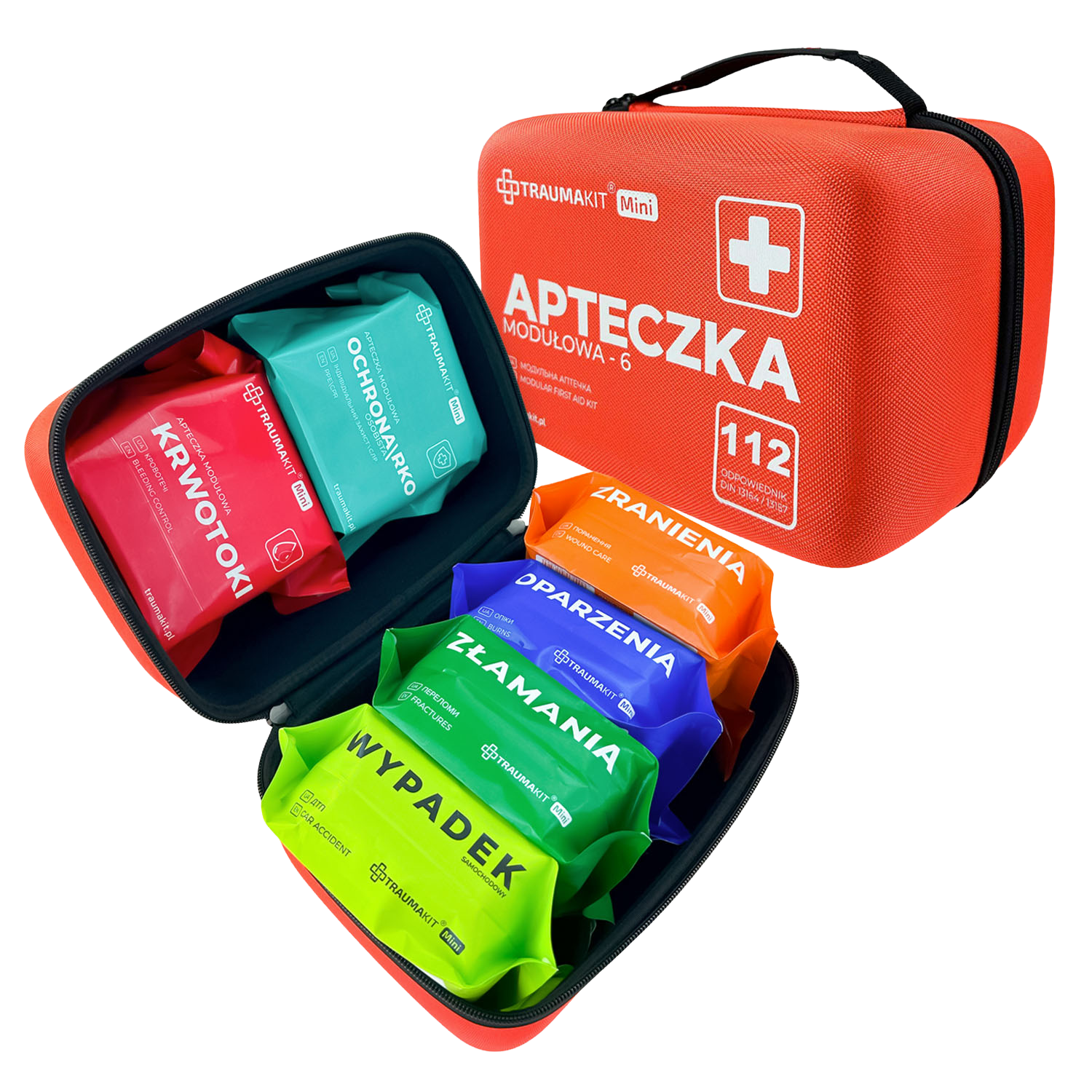 Apteczka Modułowa TRAUMAKIT Mini 6 AKROZW (DIN) to najbardziej kompleksowy zestaw w ramach systemu TRAUMAKIT Mini, zawierający sześć modułów: Ochrona Osobista, Krwotoki, Zranienia, Oparzenia, Złamania i Wypadek. Jest to rozbudowany odpowiednik standardowych apteczek DIN13164 i DIN13157, oferujący znacznie więcej dzięki bogatemu wyposażeniu w materiały opatrunkowe wysokiej jakości.